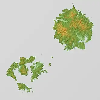 Dōgo to the east is the largest island in area, and has the highest elevation, Mount Daimanji, at 608 metres (1,995 ft) above sea level. The Dōzen group of islands to the west are all portions of single ancient volcanic caldera which collapsed, leaving three large islands (Nishinoshima, Nakanoshima and Chiburijima) and numerous smaller islands and rocks in a ring formation surrounding a central lagoon.[2] The archipelago is approximately 40-80 kilometres (43 nmi) north of Honshu coast at its closest point. For administrative purposes, the Japanese government officially considers the disputed islet of Liancourt Rocks (Dokdo or Takeshima) to be a part of the town of Okinoshima on Dōgo.