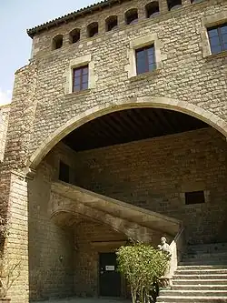 The oldest part of the Hospital de la Santa Creu is an impressive example of Catalan civil-Gothic architecture.[1] The interior boasts several large vaulted halls. Also of note is the cross vaulted Galeria del pati, which borders the inner garden, and the arched entrance to the library at the patio, built in the sixteenth century.[4]