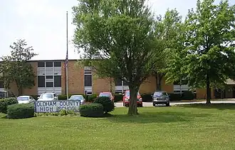 In the early 20th century, high school classes in Oldham County were held in a two-room house in Centerfield. Oldham County had established the Oldham County Public High School by 1903,[2] i a purpose-built high school building. It moved to North Hwy 393 in LaGrange in 1953. The old high school was converted into First Baptist Church of La Grange in the mid-1960s. The original building burned in the 1990s, replaced by a church.[2]