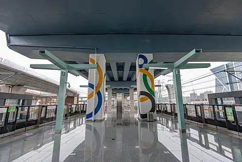Olympic Sports Center station,[1] originally in the plan, it was called Guangyuan Road station. This is a planned elevated three-story subway station with an island platform. The station is served for Line 4 of Ningbo Rail Transit as a destination terminal which was started to construct since 2015.[2][3][4]
