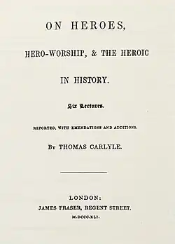 On Heroes, Hero-Worship, & the Heroic in History is a book by the Scottish essayist, historian and philosopher Thomas Carlyle, published by James Fraser, London, in 1841. It is a collection of six lectures given in May 1840 about prominent historical figures. It lays out Carlyle's belief in the importance of heroic leadership.