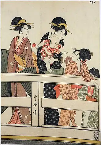 Nine elegantly-dressed[12] tall women[6] stand or lean on the bridge, watching the river flow beneath. Some hold hand fans or parasols,[12] suggesting a hot summer scene. The women come from different social rankings. From details such as the hairstyles some of the women are recognizable as geishas. The women in the upper left are women-in-waiting from a feudal lord's palace, and are wearing age-bōshi[b] head-dresses, which were popular during Japan's Edo period. A woman holding a child stands at the centre,[8] and to the right is a group of entertainers.[9] Behind the woman furthest to the right holding a round hand fan can be seen a water-seller's equipment; fresh water was scarce in the area, as it was made from reclaimed land by the ocean. Such merchants sold slightly sweetened water from distant springs.[6]