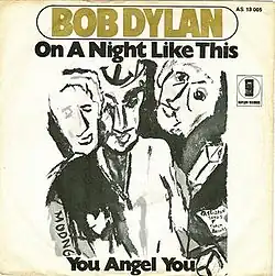 "On a Night Like This" is a song written by Bob Dylan and recorded in November 1973. It first appeared on Dylan's 14th studio album, Planet Waves, as the opening track.[1] It was also released as the lead single from the album and reached #44 on the Billboard Hot 100[2] The song later appeared on several Dylan compilation albums including Biograph, in 1985, and Dylan (three-disc version), in 2007.[3][4]