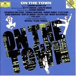 On the Town is a 74-minute live album of Leonard Bernstein's musical, performed by Tyne Daly, Meriel Dickinson, David Garrison, Thomas Hampson, Cleo Laine, Evelyn Lear, Marie McLaughlin, Kurt Ollmann, Samuel Ramey, Frederica von Stade, London Voices and the London Symphony Orchestra under the direction of Michael Tilson Thomas. It was released in 1993.