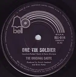 "One Tin Soldier" is a 1960s counterculture era anti-war song written by Dennis Lambert and Brian Potter. Canadian pop group The Original Caste (consisting of Dixie Lee Innes, Bruce Innes, Graham Bruce, Joseph Cavender and Bliss Mackie) first recorded it in 1969 for both the TA label and its parent Bell label.