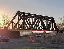 By the 1950s, the first reported collisions of commercial vehicles into the bridge's 10-foot-9-inch deck occurred in spite of a long-standing commercial vehicle ban, as the Onondaga Lake Parkway gradually turned from a leisurely route into a major thoroughfare route between Liverpool and Syracuse.[1] This remains a common occurrence to this day, with the New York State Department of Transportation revealing that between 2020 and 2022, an average of just over 9 vehicles per year have struck the bridge,[2] up from a normal average of 3 collisions per year.[3] In March 2023, three trucks hit the bridge within a span of 12 days, including two within the last three days of the month.[4][5]