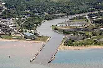 The shipping channel between the piers is 150 feet wide and 15–17 feet deep.[4] The east and west entrance piers are 2,315 feet and 2,563 feet long, respectively. A flared approach channel extends 850 feet to deep water. The inner basin is 900 feet long and 12 feet deep. The Ontonagon harbor is the only refuge for small craft between the Keweenaw Waterway upper entrance and Black River Harbor.[4]