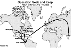 U.S. Immigration and Naturalization Service map of alien smuggling routes broken by Operation "Seek and Keep" in 1998. The cartel moved aliens from India through Moscow and on to Cuba, from where the aliens were transported by sea or traveled by land into the U.S.
