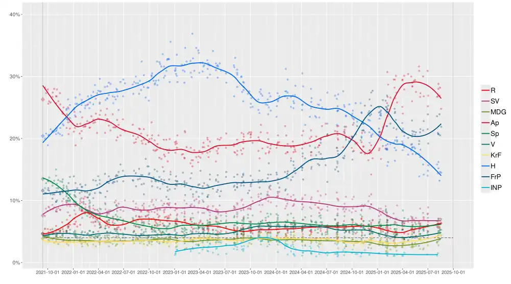 - ^ "pollofpolls.no - Gjennomsnitt av nasjonale målinger med spørsmål om stortingsvalg august 2025". www.pollofpolls.no. Retrieved 2025-08-16.