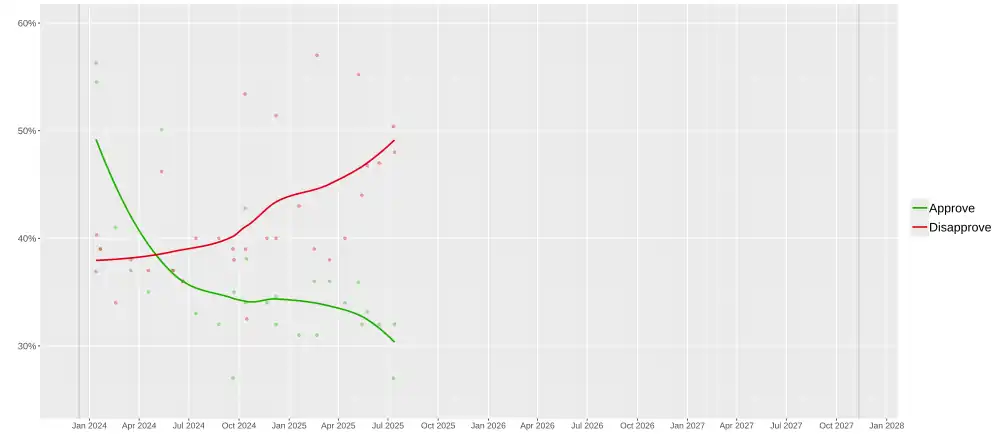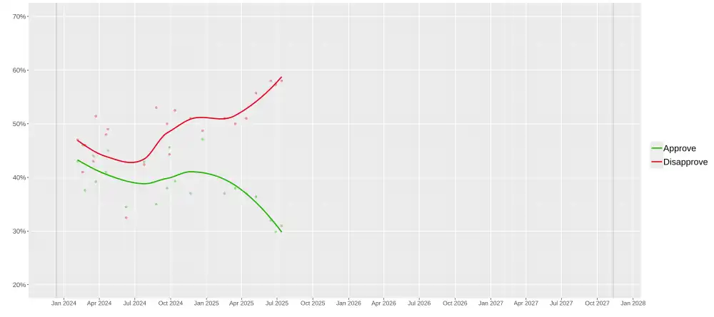 | 5–8 May 2025 | AtlasIntel | 5,071 | 35.9 | 55.2 | 8.8 | –19.3 | ||