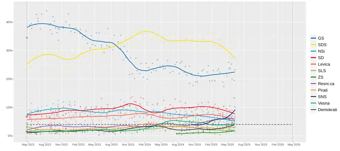 | 19–22 May 2025 | Mediana | POP TV | 704 | 17.8 | 21.4 | 3.8 | 5.8 | 3.7 | 1.4 | 1.1 | 3.0 | – | 1.5 | 2.5 | 2.7 | 4.6 | – | – | – | – | 1.4 | 6.5 | 21.0 | 0.4 | 3.6 | [20] |