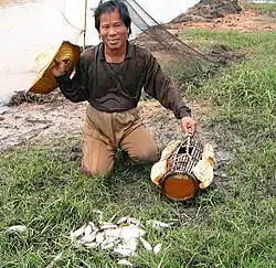 The metacercarial stage is infective to humans and other fish-eating mammals, including dogs, cats,[8] rats, and pigs.[22] Fish contain more metacercaria from September to February, before the dry season,[16] and this is when humans are usually infected.[1] Infection is acquired when people ingest raw or undercooked fish.[2] Dishes of raw fish are common in the cuisine of Laos and the cuisine of Thailand: koi pla, raw fish in spicy salad larb pla,[19] salted semifermented fish dishes called pla ra,[1] pla som[19] and som fak.[18] The natural definitive host is the leopard cat (Prionailurus bengalensis).[1] The young adult worm escapes from the metacercarial cyst in the upper small intestine and then migrates through the ampulla of Vater into the biliary tree, where it develops to sexual maturity over 4–6 weeks, thus completing the lifecycle.[2]