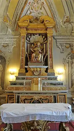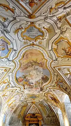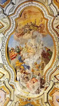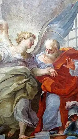 The oratory is accessed through the cloister of the convent attached to Santa Ninfa. The oratory was frescoed in 1738 by Guglielmo Borremans and his studio. The anteroom ceiling is aptly frescoed, for a congregation liberating prisoners, with a Liberation of St Peter from Jail. Another fresco depicts a Glory of St Peter. The walls are rich in Rococo decoration with quadrature. In false niches are depictions of the cardinal virtues of charity, faith, prudence, and justice; as well as depictions of Saints Francis, Acacio, Paolino di Nola, Aniano, and Rimberto.[2]
