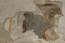 Saint John the Baptist | Fragment of a fresco that emerged during the restoration completed in 2000, which Madonna enthroned with Child (Maestà) largely overlaps. A haloed head and the bare shoulder of a male figure can be identified, whose disheveled hair suggests identification with the Baptist, whose iconography shows him dressed in a short fur coat, without sleeves. Bisogni and Calciolari appreciate the workmanship and propose a dating to the 13th century.[2] |