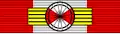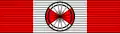 The insignia of the Chevaliers, with a diameter of 45 mm, is nickel-plated; it is worn on the left side of the chest, attached by a white moire ribbon edged with red on each side of 37 mm width.[5]