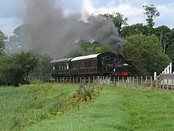 They remained in the open at Ballynahinch Junction until 1987 when they were bought by and transported to the Downpatrick and County Down Railway. No. 3 was sent to Whitehead for overhaul in 1997, and upon return to Downpatrick, gave 12 years of service between 2000 and 2012. No. 1 was similarly sent to Whitehead in 2007, returning in 2012 and taking over from No. 3. She is still in service, operating all DCDR passenger trains, with the exception of the occasional diesel special. No. 3's boiler was sent to Whitehead for overhaul in January 2016,[6] returning in early 2017, and on Thursday 24 August the locomotive was reassembled so that testing could start. No. 3 was steamed in her frames for the first time post-overhaul on 19 May 2018, and passed her final boiler inspection on 12 November 2018,[7] releasing her into traffic. Following a final general running test on 24 November 2018, No. 3 was fit for passenger traffic, hauling her first revenue-earning train since overhaul on the night of 22 December 2018.