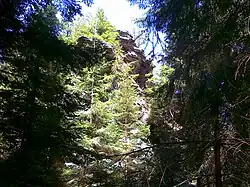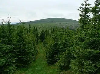 All types of forestation can be found here: spruce forest, mixed forest,[c] and deciduous forest, with spruce forest predominating.[6][7] On the western, northeastern, and eastern slopes, mixed forest areas appear as the altitude decreases, and on the western and eastern slopes, even small areas of deciduous forest can be found.[6][7] Due to the large area of the mountain, almost all slopes feature thinnings, clearings, glades, and meadows.[7] Larger rock formations are found on the northern Stráně slope, the southern slope near the secondary summit Orlík–JV, and the eastern Dlouhá slope, which also features numerous rock groups.[6] On the eastern Dlouhá slope, about 1,170 meters east of the peak, at an elevation of 1,025 meters above sea level, lies a rock group named Dlouhá.[2][6]