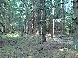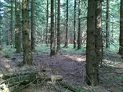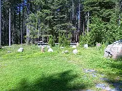 At the base of the northwestern Žárný vrch slope, near the yellow tourist trail, close to a cabin named Opavská chata, about 2.3 km northwest of the summit, lies a forest cemetery (Czech: Lesní ruský hřbitov). It is the resting place of Russian prisoners of war who died of typhus between 1941 and 1943 while working during World War II. They were imprisoned in the Rejvíz camp, established near the cemetery, and their graves are marked with stones of varying sizes.[2] The cemetery has been reconstructed multiple times, most recently in 1999.[8] The cemetery holds the remains of 23 prisoners, as listed on a special informational plaque placed there.[9]