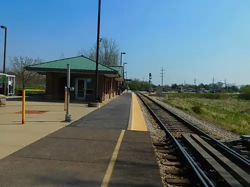 Orland Park 179th Street is one of three stations on Metra's SouthWest Service in Orland Park, Illinois. The station is 28.7 miles (46.2 km) away from Chicago Union Station, the northern terminus of the line.[3] In Metra's zone-based fare system, 179th Street is in zone 4. As of 2018, Orland Park 179th Street is the 162nd busiest of Metra's 236 non-downtown stations, with an average of 208 weekday boardings.[2] The station was the southern terminus of the line from January 3, 1995 to January 30, 2006 when it was extended to New Lenox and Manhattan.[4]