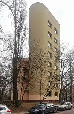 The blocks reflect International Style within modernism, akin to Germany's Bauhaus and Le Corbusier's French works.[8] The design positioned them as a "self-contained crystallizing element" and a "dominant spatial feature" in Łódź's urban landscape.[9] Mostly aligned north-south, the "clerical quarter" features long, enclosed blocks with courtyards, lacking standalone public buildings, resembling Frankfurt's 1927 Riedhof estate.[49] Structures include stairwell, gallery, or hybrid stairwell-gallery designs, using Le Corbusier's basic forms.[9][16] Facades lack ornamentation, with aesthetics derived from balanced use of plasterwork, ceramic brick, wood, and glass.[16]