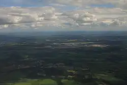 The airport is located 19 nautical miles (35 km; 22 mi) northeast of Oslo, at Gardermoen at the border of municipalities Nannestad and Ullensaker, in Akershus county.[4] It has two parallel roughly north–south runways measuring 3,600 metres (11,811 ft) and 2,950 metres (9,678 ft) and 71 aircraft stands, of which 50 have jet bridges. The airport is connected to the city center by the high-speed railway Gardermoen Line served by mainline trains and Flytoget. The percentage of passengers using public transport to get to and from the airport is one of the highest in the world at nearly 70%.[5] The ground facilities are owned by Oslo Lufthavn AS, a subsidiary of the state-owned Avinor. Also at the premises is Gardermoen Air Station, operated by the Royal Norwegian Air Force. An expansion with a new terminal building and a third pier opened in late April 2017.[6][7]