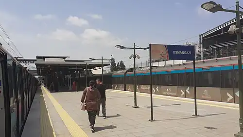 Osmangazi station (Turkish: Osmangazi istasyonu) is a station on the Marmaray commuter rail line in Gebze, Turkey. It was previously a station on the Haydarpaşa suburban until 2013, when commuter rail service was suspended. The original station was opened in 1954 with two side platforms and demolished in 2013.[1] Construction of the new station started shortly after and was structurally completed in 2014, along with the other eight stations located between Pendik and Gebze. Commuter rail service resumed on 13 March 2019.[2]