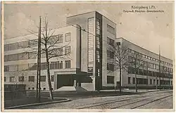In 1930 the Mädchengewerbeschule moved to a new building on Beethovenstraße and Loewestraße in Vorderhufen. The new school, which cost 2,092,00[3] or 2,245,000[1] RM, was designed by Hanns Hopp and Georg Lucas in the Bauhaus style and constructed from 1928 to 1930. It contained classrooms for chemistry, physics, cooking, and drawing, a gym, offices, a small boarding school, and living quarters for the director and teachers.[3] It was colloquially known as the "Mädchenaquarium" (girls' aquarium) and "Klopsakademie".[1] The new Mädchengewerbeschule and the Haus der Technik were the greatest works of Hopp during the 1920s.[4]