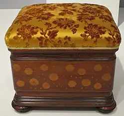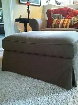 An ottoman is a piece of furniture.[1] Generally, ottomans have neither backs nor arms. They may be an upholstered low couch or a smaller cushioned seat used as a table, stool or footstool. The seat may have hinges and a lid for the inside hollow, which can be used for storing linen, magazines, or other items, making it a form of storage furniture.[2][3] The smaller version is usually placed near to an armchair or sofa as part of living room decor, or may be used as a fireside seat.[4]