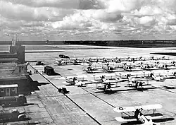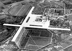 Naval Air Station Ottumwa (NAS Ottumwa) was constructed as a Naval Training Center shortly after America's entry into World War II. The Navy, faced with providing aviators and support personnel for a two-front war, began a massive campaign of rapid expansion. On April 15, 1942, the U.S. Navy Site Selection Board met with Ottumwa city officials and determined a 1,400-acre tract of land a few miles north of the city would be a suitable location for a primary flight training facility. Based on their recommendation, Navy Secretary Frank Knox approved the location on July 9, 1942, and on August 6, 1942, groundbreaking for the base was held.[4] The first group of Naval Aviation Cadets arrived at the base on March 10, 1943, and flight training officially began four days later. Another first for NAS Ottumwa occurred on May 30, 1943, when the first group of U.S. Navy WAVES arrived.[4] At its peak, NAS Ottumwa was averaging one thousand flight hours per day, and over 600,000 flight hours logged by the time the base was closed.[5] Aircraft used in flight training were mostly the SNJ, the N3N Canary, and the N2S Kaydet. Around sixty buildings—hangars, control tower, barracks, classrooms and sundry others—were built for the Navy's use. The base avenues were named for U.S. Navy aircraft carriers that served early in World War II: Enterprise, Hornet, Langley, Lexington, Wasp and Yorktown. Streets were named for U.S. Navy Admirals Dewey, Farragut, Moffett, and Sims along with Marine Corps General Smedley Butler and American Revolutionary War naval hero John Paul Jones.[6]