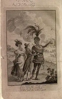 Frontispiece of the 1790 edition, illustrating the characters Azâkia, Celario, and Ouâbi.[1]