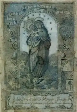 The history of the devotion to Our Lady of Brotas in the municipality of Piraí do Sul is distinct from other places, as it was influenced by the Portuguese. It began in 1808, when Friar Antonio de Sant'Ana Galvão, now Saint Friar Galvão, on a mission for the Franciscan Province of the Immaculate Conception, arrived on the banks of the Piraí River.[8] He decided to stay in the village for a few days, preaching and attending to the local people. During his stay, he lodged at the house of Ana Rosa Conceição de Paula. When he left the house where he had been welcomed, he gave her a print of Our Lady of the Barracks,[9] with the dedication: "Souvenir of Friar Galvão.", and saying:[8]