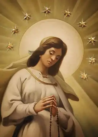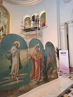 On June 12, 1959, with the consent of Mr. Feliċ Borg and with the approval of Archbishop Gonzi and the Provincial of the Capuchins at that time, the agreement was changed to change the title of the church to Our Lady of Lourdes. The next day, June 13, a temporary picture of Our Lady of Lourdes was placed in the church.On June 14, 1959, the painter profs. Ġuzeppe Briffa, from Birkirkara, started working on the draft of the new title and offered to do it free of charge. On December 17, 1959, the titular painting was finished, and the same painter, Briffa, was brought to the church. On December 20, 1959, the day on which the church was opened and blessed, Archbishop Michael Gonzi, after giving the sacramental blessing, unveiled and blessed the titular picture of Our Lady of Lourdes. On July 16, 1979, the work of gilding the frame of the titular frame began.[5]
