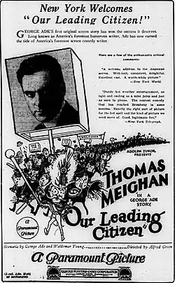 Our Leading Citizen is a 1922 American silent comedy film directed by Alfred E. Green and written by George Ade and Waldemar Young. The film stars Thomas Meighan, Lois Wilson, William P. Carleton, Theodore Roberts, Guy Oliver, Larry Wheat, and James Neill. The film was released on June 14, 1922, by Paramount Pictures.[1][2]