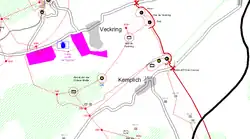Coucou is a petit ouvrage[nb 1] with two combat blocks, overlooking the village of Kemplich. The blocks are linked by an underground gallery with barracks and a utility area (usine).[6] The galleries are excavated at an average depth of up to 30 metres (98 ft).[7]
