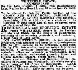 When Maria Josephine Gough inherited the Hall in 1878 she had been a widow for sixteen years. At his time she was living in Abingdon in Berkshire with her only child Josephine Mary Agnes Gough (1860-1912). She and her daughter continued to live in Abingdon and they rented Whitefield Hall to several tenants. Maria Josephine died in 1888 and her daughter inherited the property. Josephine Mary Agnes did not immediately move to the Hall but the Census data of 1901 shows that she and her friend Mary Edith Macray were living there by this date. Josephine died in 1912 and left the house to her friend Mary as she had no other close relatives. In 1922 Mary Macray sold some of the outlying portions of the estate.[12] In the following year she married Reverend Donald Jones who was the Principal of Bede College Durham.[13] They both lived at Whitefield but in 1925[14] he died at the age of 67 and four years later she died. The house was put it on the market for sale.[4]