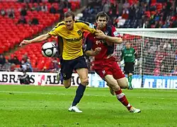 Oxford United finished eighteenth in the 1985–86 First Division, avoiding relegation on the last day of the season after defeating Arsenal 3–0.[31] They also won the Football League Cup, known at the time as the Milk Cup under a sponsorship deal. As winners, Oxford would have qualified for the following season's UEFA Cup, had it not been for the ban on English teams that had resulted from the previous year's Heysel Stadium disaster.[32] After beating fellow First Division side Aston Villa in the semi-final 4–3 on aggregate,[33] Oxford faced Queens Park Rangers in the final, which was held at Wembley Stadium on 20 April 1986. The game finished 3–0 with goals from Trevor Hebberd, Ray Houghton and Jeremy Charles. After the match long-serving physiotherapist, 72-year-old Ken Fish, collected one of the winner's medals, instead of manager Maurice Evans. Evans felt that Fish deserved the medal for his service to the club, and so gave him his, in what was seen as an "unprecedented gesture".[34] It was the last time the League Cup was played under the name "Milk Cup", sponsors Littlewoods taking over the following season.[35] John Aldridge scored 23 goals across the season, while their survival was helped by the arrival of veteran Steve Perryman from Tottenham.