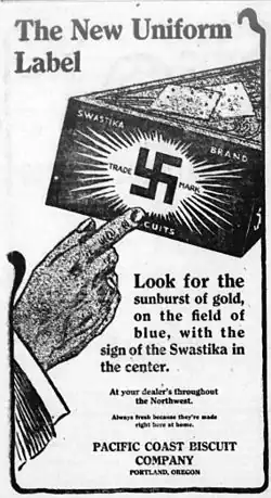 The Pacific Coast Biscuit Company was a conglomerate of baking companies headquartered in Portland, Oregon, United States that manufactured cookies, crackers, candy, and macaroni.[1] The company, also known as Pacific Coast, was formed in 1899, and it was purchased by the National Biscuit Company in 1930. It was the only baking company in the United States to trademark a swastika.