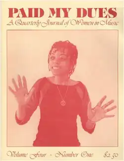 Paid My Dues: Journal of Women & Music was an American feminist periodical published from 1974 until 1980. Paid My Dues was the first, and for some time the only, feminist music journal.[1] Published quarterly, it provided a literary space for women to write and share their experiences and ideas about music. It published articles on instruments, reviews on songs and albums, as well as music sheets. In contributing to the feminist movement of the late '70s, the magazine was devoted to celebrating the culture and history of women and music.[2][3]