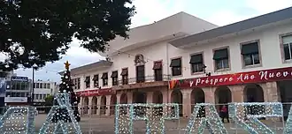 The palace has two floors and has a central patio in the Andalusian style, in addition to having portals on its main facade. Its central balcony has a panoramic view of the Plazuela República.[1] The building in its current form was built in 1943 by local engineer Joaquín Sánchez Hidalgo, replacing the original building built in 1853. Its construction was carried out in an area of lagoons and the complex consisted of 3 buildings, the first of these, the municipal house, was completed in 1856.[2] Over the years new additions have been added, like placing quarry and a parking lot that replaced a basketball court.[3] During the Christmas holidays each year it is usually decorated with various decorations, lights and nativity scenes.[4]