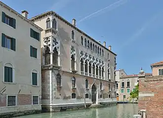 The building locates at the confluence of two canals and has two facades. The side on the Rio di Noale or Noal has a monumental façade of the late-Gothic style. The ground floor has an impressive water portal and is decorated by small arched lancet windows, while the two noble floors offer heptaforas and numerous other openings. The most valuable and visible elements of this façade are the balustrated polifora of the first noble floor and the angular mullioned windows at the both edges of the structure.[4]