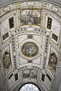 The striking ceiling of this room, decorated with festoons with fowl, vegetables and fish, alternated with floral bands, was created by Camillo Mantovano and a collaborator around 1567. The compositional scheme, with the space divided into segments through rays that converge to center, proposes in a modern key a model used in a room of the Domus aurea. The seventeenth-century painting in the center of the ceiling, Saint John baptizing the crowd derives from the homonymous painting by Nicolas Poussin of the Louvre. According to the nineteenth-century guides, it would replace a painting attributed to Giorgione and depicting the Four Elements.