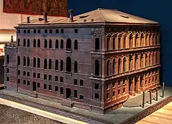 In the Correr Museum, one can see a wooden model of what the completed palazzo would have looked like. There are two theories regarding the building's incompleteness: according to one, the influential Corner family, who owned the eponymous palazzo located opposite, on the other side of the canal, feared that their palazzo would be overshadowed and ensured that the building was not completed; according to another theory, the Venier family heirs, fulfilling their late father's will, which mandated the construction of a new palazzo but lacking the funds to complete it, started the construction as the will required but left it unfinished.[2]
