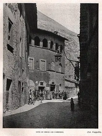 The building was erected towards the end of the 13th century by Cante de' Gabrielli (1260-1335), who was Signore or lord of Gubbio with the title of Captain of the People (capitano del popolo). The building was one of the city's first public buildings.[1] The palace, whose architect remains unknown, was used as both private residence and public office by Cante Gabrielli, and was built on land already belonging to his family. This area of the town was largely under the influence of the Gabrielli, as exemplified by the fact that other neighbouring constructions, including the towered family palace still visible along the eponymous street, belonged to them.