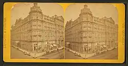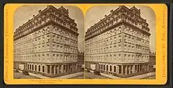 The first Palmer House was built as a wedding present from Potter Palmer to his bride Bertha Honoré. Located at State and Quincy,[4] it opened on September 26, 1870.[5] It burned one year later on October 9, 1871, during the Great Chicago Fire. Palmer had already begun construction of a new hotel at State and Monroe prior to the disaster.[6][7]