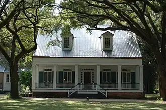 The plantation house is a 1+1⁄2-story building on brick piers with a twelve-foot-wide porch set under the roof line.[5][6] The window panes of the house are more than 170 years old and contain etchings with names and initials, and it is said to be how the family would check if their engagement diamond rings were real.[2] The doorknobs are lower than a modern home, because the average height of people was shorter.[2]