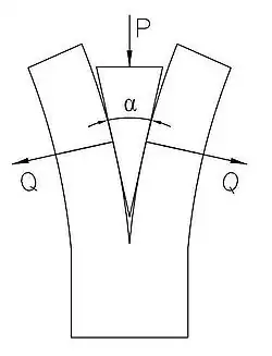 The wedge interposes the compression-resistant properties of its solid-state structure to change the direction and strength of a vector force transmitted by it. In the figure, the axeman imparts a momentum to the blade which, impacting the wood, generates a force acting at P along the length of the blade. The force does not leave in that direction because there is no bearing surface there. Instead, the force departs at right angles to the bearing surfaces at Q, forcing the wood apart and imparting momentum to any chips that fly off.