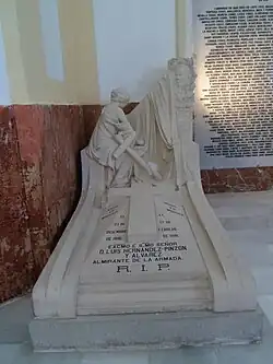Numerous distinguished Spanish mariners[8] are interred here or have monuments honouring them. The government policy was only to place officers in the monument, but in some cases enlisted men were included anonymously in groups of remains known to have included the captain, and in at least one case the crown intervened to memorialize under his own name a seaman who had died for his country of wounds inflicted during an intense sea battle (see below). In the mausoleum part of the monument, there is something like a tomb of the unknown sailor, a pool commemorating all those buried at sea, and a dedication to all mariners everywhere regardless of rank or educational status who served in the Spanish Navy.