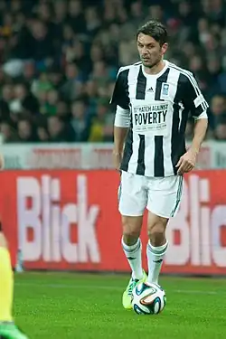 Maldini was renowned for his aerial abilities, sliding tackles, speed, and stamina.[106][107][108][109][110] He was also an excellent attacker, as he scored and assisted many goals throughout his career.[111][112] In the final few years of his career, as he lost speed, he was moved to a centre-back position, where he excelled in relying on his experience, aerial abilities, and tackling to stop attackers.[113]