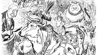 In response to the Fat Ox Parade, which took place on Mid-Lent Thursday, 12 March 1896, Parisian students organized a procession through the Latin Quarter. The students carried a papier-mâché ox, which they had named Minosdaure. This ox served as a mount for a Prince Carnival, who was dressed as winged Cupid. Surrounding the float were young "female students" dressed as gold mines. These students had costumes similar to those worn in year-end revues. They handed out food vouchers to the public.[69]