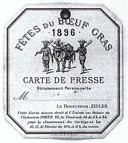 In 1896, preparations for the Fat Ox Festival unfolded on a grand scale. A Fat Ox Festival Committee was formed,[63] led by Charles Zidler, a former butcher, son of a butcher, and entertainment organizer. A subscription campaign was launched, and the Parisian authorities contributed 25,000 francs toward the estimated 100,000-franc cost of the parade.[64] On Sunday, 16 February 1896, at 11 am, the commencement of the parade was marked by a cannon blast. The ox, a specimen of the Norman breed, embarked from the Palais de l'Industrie on the Champs-Élysées.[65] Over the subsequent two days, two additional animals were exhibited: a Limousin ox on Monday and a Charolais ox on Tuesday. It is noteworthy that neither of these animals appear to have been assigned a name. The event garnered widespread enthusiasm.[66][67] However, during this period, authorities were actively discouraging the practice of advertising, as evidenced by the Paris Police Prefecture's General instructions for municipal police, which included directives such as "Do not allow advertising floats to join the parade."[68]
